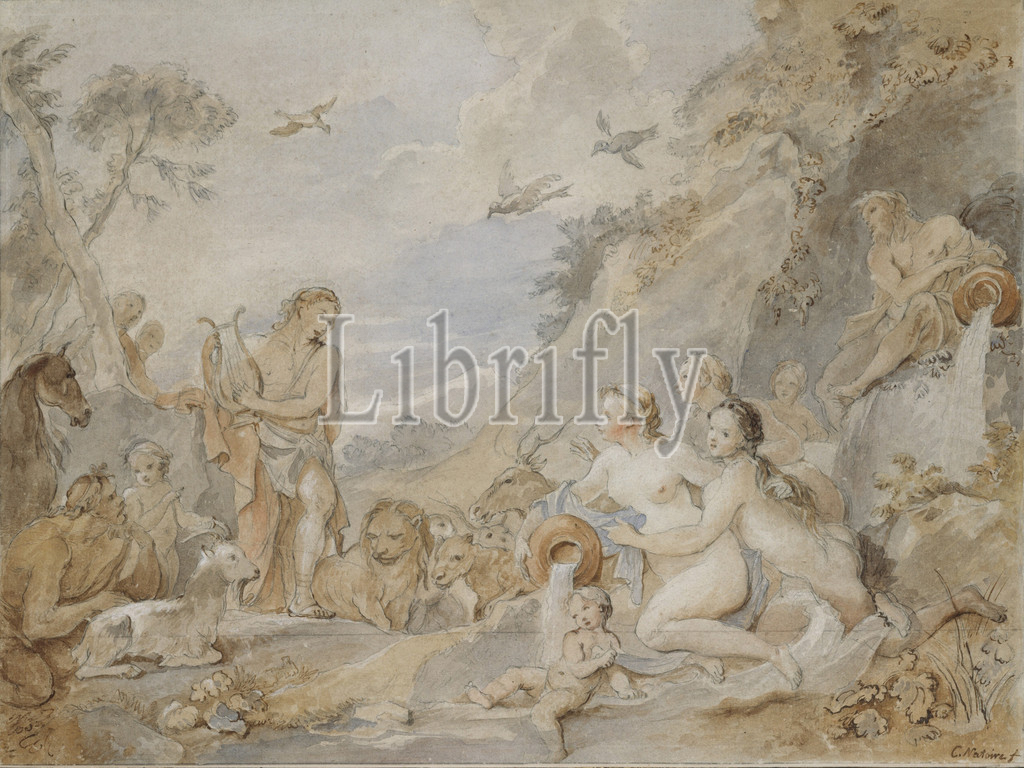 Orpheus Charming, Nymphs, Dryads, Animals, 1757, Pen, brown ink, brown, gray wash, pale blue, yellow, pink watercolor, white heightening, preliminary drawing, pencil, black chalk, 32 3/16 x 16 3/4, 81.8 42.5 cm, Drawings, Charles Joseph Natoire, French, Nîmes, 1700–1777, Castel Gandolfo