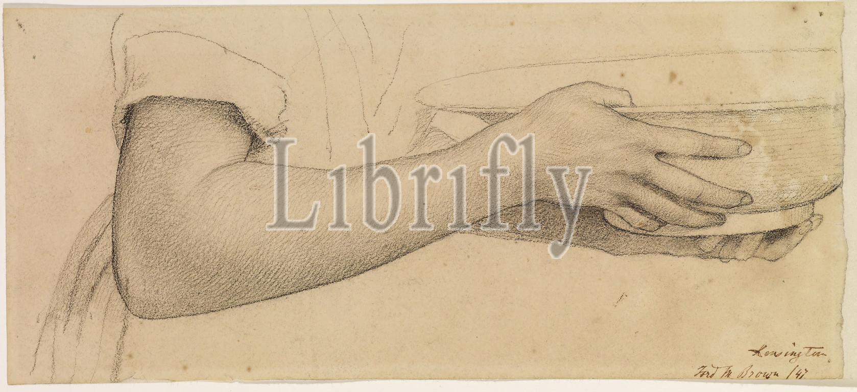 Oure Ladye of Saturday Night, Study of Arm and Hands for Angel Holding Bowl of Water, 1847 Ford Madox Brown, Art Movement, Pre-Raphaelite, Drawing, Pencil, Chalk, Angel, Sketch, Bowl, Study, Hand