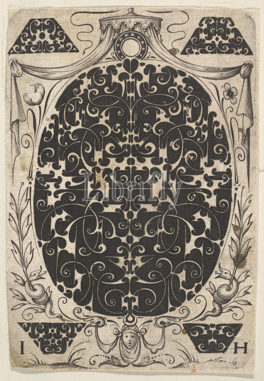 Oval Pendant Decorated, Schweifwerk, Surrounded, Smaller Motifs, Crowned, Baldachin, ca, 1614–19, Blackwork, engraving, Sheet, 4 1/16 x 2 13/16, 10.3 7.1 cm, Jacques Hurtu, French, active, 1584–1635, Part, series, 6, goldsmiths designs executed, blackwork technique, Design, oval pendant, presumably, reverse, watch case, medaillon, decorated, design, surrounded, four smaller, motifs, shape, trapezoid, done, blackwork