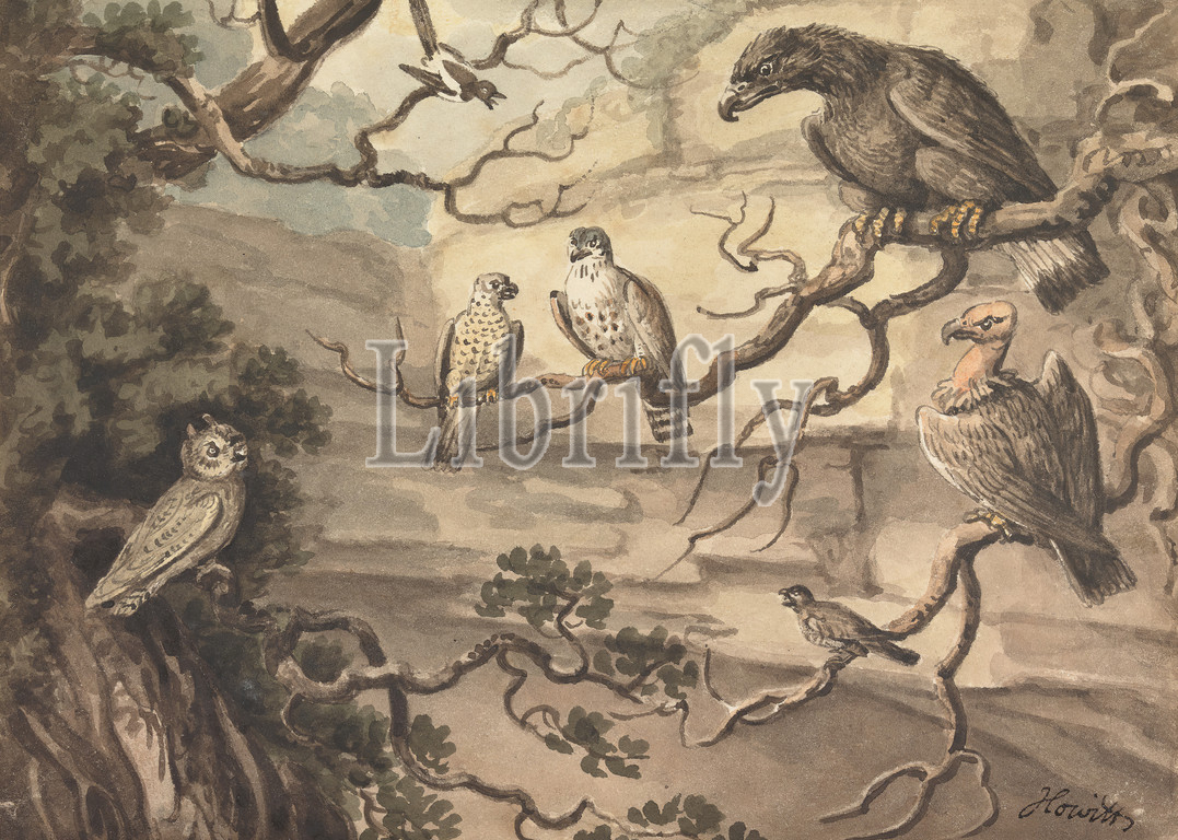 Owl, Eagle, Two Falcons, Vulture, Birds Perched, Trees, Samuel Howitt, 1756–1822, British, Watercolor, pen, brown ink, traces, graphite, medium, slightly textured, cream, wove paper, Sheet, animal art