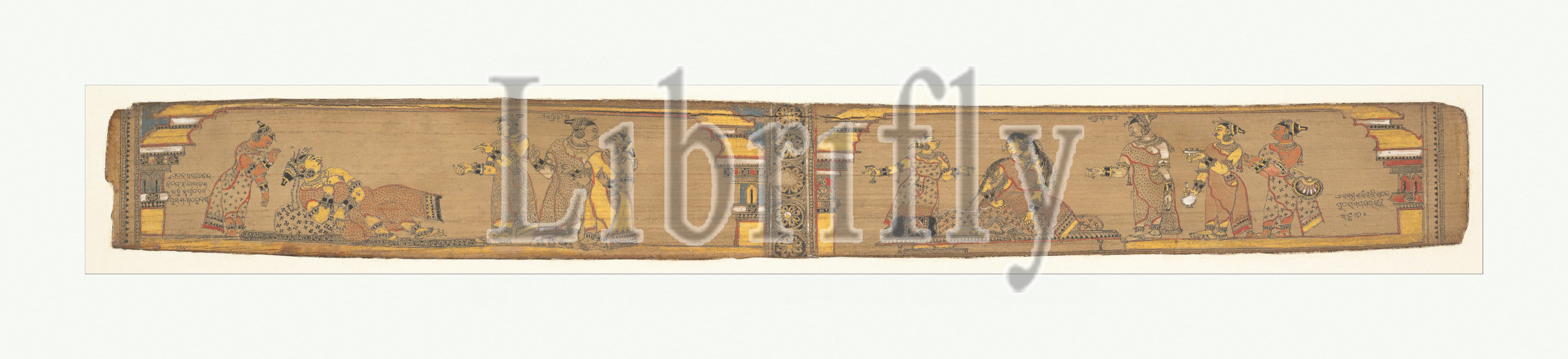 Page from a Dispersed Romance of Chandrabhanu and Lavanyavati, 16th–17th century, India (Orissa), Ink and opaque watercolor on palm leaf, 1 11/16 x 16 in. (4.3 x 40.6 cm), Paintings, In India, palm leaves were utilized as book pages during the medieval period. By the fiftheenth century, paper had largely supplanted them. In Orissa, however, the ancient tradition continues to this day