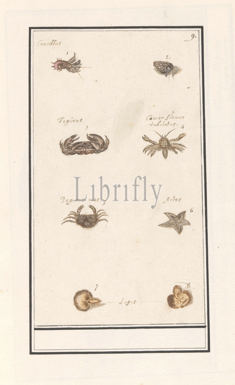 Page, eight crustaceans, molluscs, Sheet, numbers 1-8, partly, Latin names, Numbered top right, 9, Part, sixth album, drawings, fish, shells, insects, Sixth, twelve albums, animals, birds, plants, 1600, commissioned, Emperor Rudolf II, explanations, Dutch, Latin, French, crustaceans, crab, SHRIMP, echinoderms, starfish, Anselmus Boetius de Boodt, 1596, 1610, paper, pencil, chalk, watercolor, paint, ink, pen