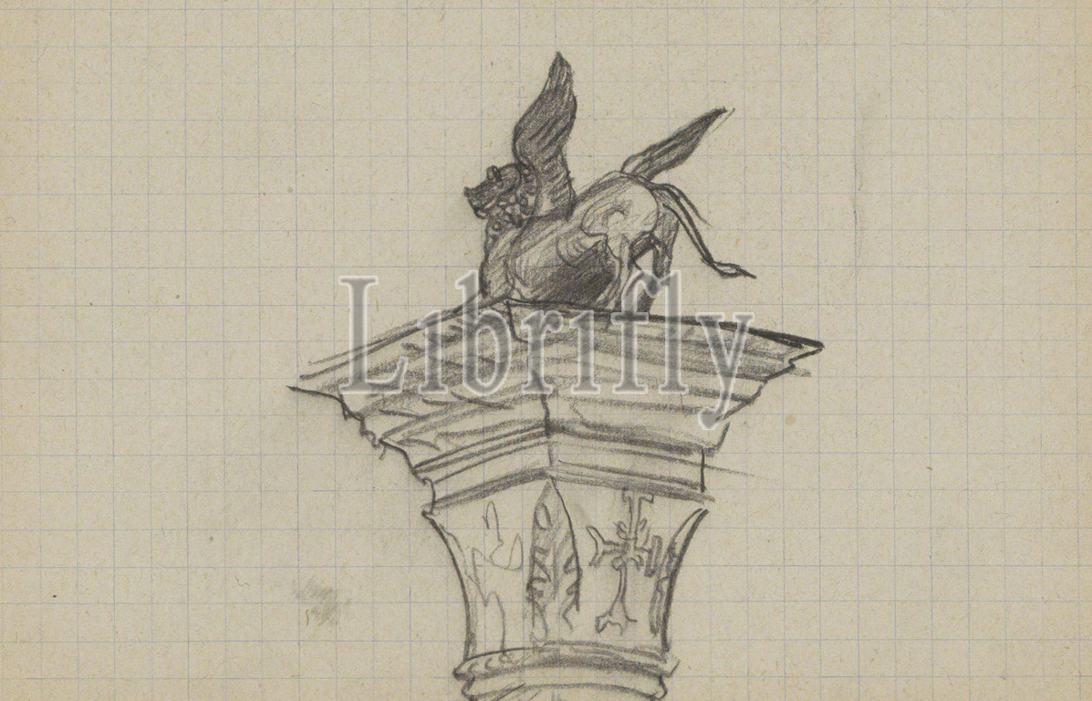 Page 15, sketchbook, 28 pages, Back, column, statue, winged lion, Saint Mark's Square, Venice, draughtsman, Marius Bauer, Venice, 1895, Marius Bauer, 1895
