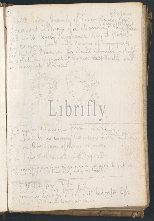 Page 9, Two Ideal Female Heads, Notes on Methods of Drawing, Alexander Cozens, 1717–1786, British, 1746, Graphite on medium, slightly textured, cream laid paper, bound in vellum, Spine: 7 5/8 inches (19.4 cm) and Sheet: 7 3/8 x 5 1/8 inches (18.7 x 13 cm), architectural subject, buildings, forum, Grand Tour, ruins, sketches, trees, Italy, Rome