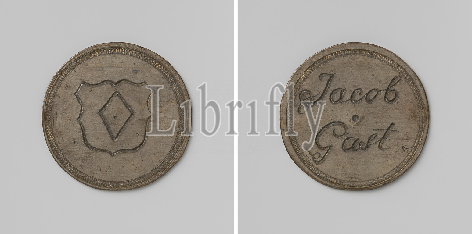 Painters and glaziers guild of Enkhuizen, guild token of Jacob Gast, Brass medal with hole in the middle. Front: diamond in a heart-shaped shield within the cable edge. Reverse: inscription within cable line, Enkhuizen, Jacob Gast, anonymous, 1636, brass (alloy), engraving, d 3.9 cm × w 10.62 gr