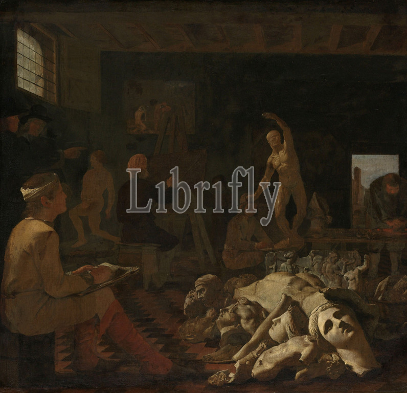 A Painter’s Studio, painter's studio, two boys, drawing, plaster model, foreground, pile, plaster models based, antique images, left, man paints, male nude model, two visitors watch, right, man, rubbing paint, table, wall hangs, painting, workshop, studio painter, painter studying classical remains, painter preparing colors, Michael Sweerts, c, 1646, 1650, canvas, oil paint, paint