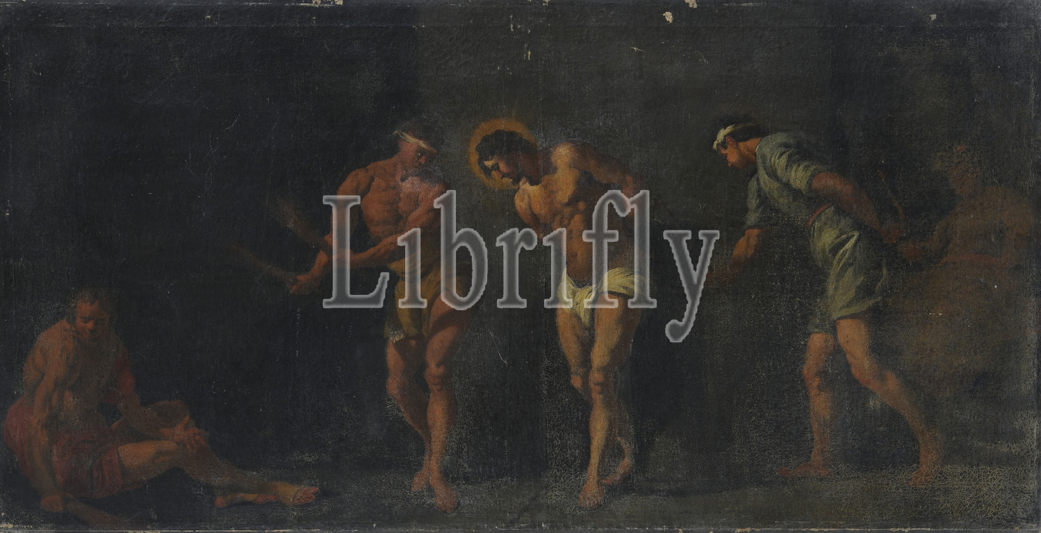 painting, Willem van Ingen, c. 1680, canvas, oil paint, painted, General: 80.5 x 151 x 2cm 805 x 1510 x 20mm, biblical representation, christ, lead, Painting depicting the Flagellation of Christ. Christ is standing a little to the right of the center, three-quarters to the left, with his hands on his back tied to a low column. To his left is an executioner with two rods and a second servant is resting on the floor. On the right is a third servant with a scourge of points in the right hand. On the far right a vague figure, possibly a judge or a statue of the gods. Not signed, 1926
