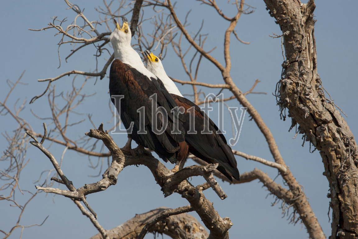 A pair of calling African Fish Eagles in a tree, Haliaeetus vocifer, South Africa