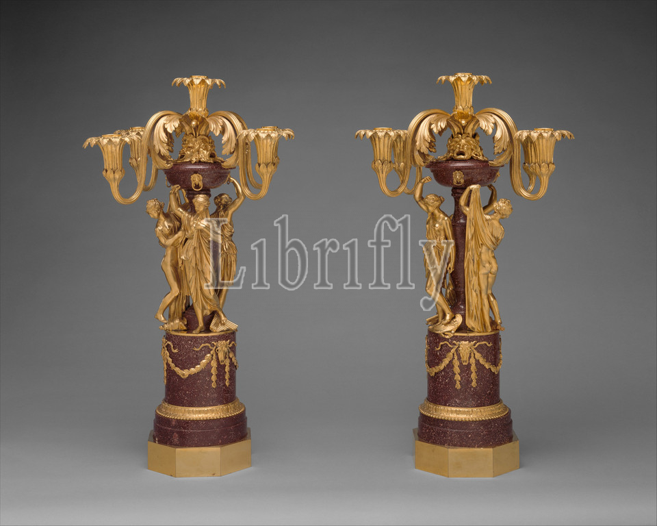 Pair, five-light candelabra, Luigi Valadier, Italian, Rome 1726–1785 Rome, collaboration, Lorenzo Cardelli, 1774, Rome, Gilt bronze, porphyry, Overall, 27, 15 15/16, 68.6, 40.5 cm, Metalwork-Gilt Bronze, 1726–1785, possibly, in collaboration with Lorenzo, death, father, 1763, Prince Marcantonio Borghese, 1730–1800, inherited, great fortune, included, finest private, art, collection, Eternal City., 1, subsequent role, important collector-patrons, Neoclassical period, –rivaling, own family, Cardinal Scipione, Borghese, 1576–1633, Early Baroque, era, –, received, attention, deserves