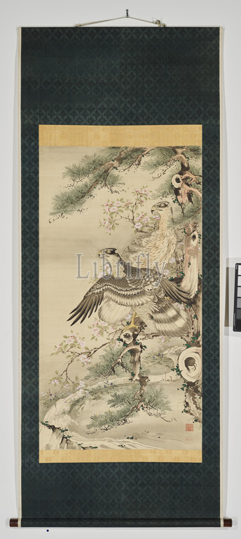 Pair of Hawks with Branch and Blossoms, Soga Shōhaku (Japanese, 1730-1781), Edo, 1770's, ink, color and gold on silk, 86 x 37-1/2 in. (installed) 51-1/4 x 27-1/2 in. (image), Seal: Jasokuken Shohaku Seal: Meiyu, Asian Art