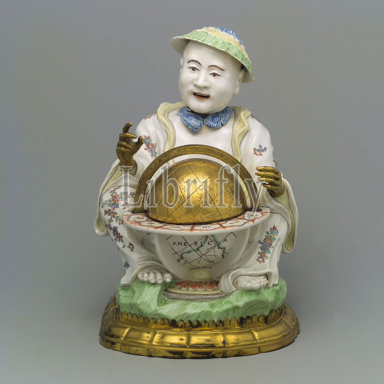 Pair, seated figures, globes, ca, 1735, French, Chantilly, Soft-paste porcelain painted, colored enamels, tin glaze, gilt bronze, Height, 6 1/2, 16.5 cm, Ceramics-Porcelain, seventeenth, eighteenth centuries, Asian countries, source, considerable fascination, allure, Europeans, frequently chosen, subjects, decorate ceramics, works, art produced, Europe, depictions, rarely based, firsthand knowledge, thus, usually fanciful