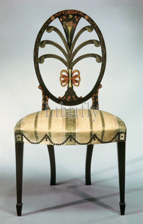 Pair, side chairs, 1795–1800, Philadelphia, Pennsylvania, United States, American, Painted maple, white pine, 38 1/2 x 21 18 1/2, 97.8 54.6 47 cm, Furniture, design, oval-back chair, based, engraving, George Hepplewhite, Cabinet-Maker, Upholsterer, Guide, 1788, chairs thought, set, twenty-four, oval back, painted white, blackish brown