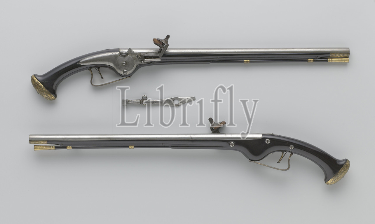 Pair, wheellock pistols, spanner, Wheellock pistol, Part, couple, wheel, lock, provided, hook, bottom, top, round barrel, flat, back, stamped, PM mark, ebony flask, grooved front drawer, Apart, gold-plated iron trigger guard, gold-plated copper fittings, engraved, flowers, foliage, consisting, chest, drawers, two loading rod sleeves, butt cap engraved, imprinted, background marked, dots, ebony loading stick, gold-plated brass cap, Peter Meesen, Utrecht, 1655, 1660, ebony, wood, gilding, material, iron, metal, brass, alloy, engraving, l 68
