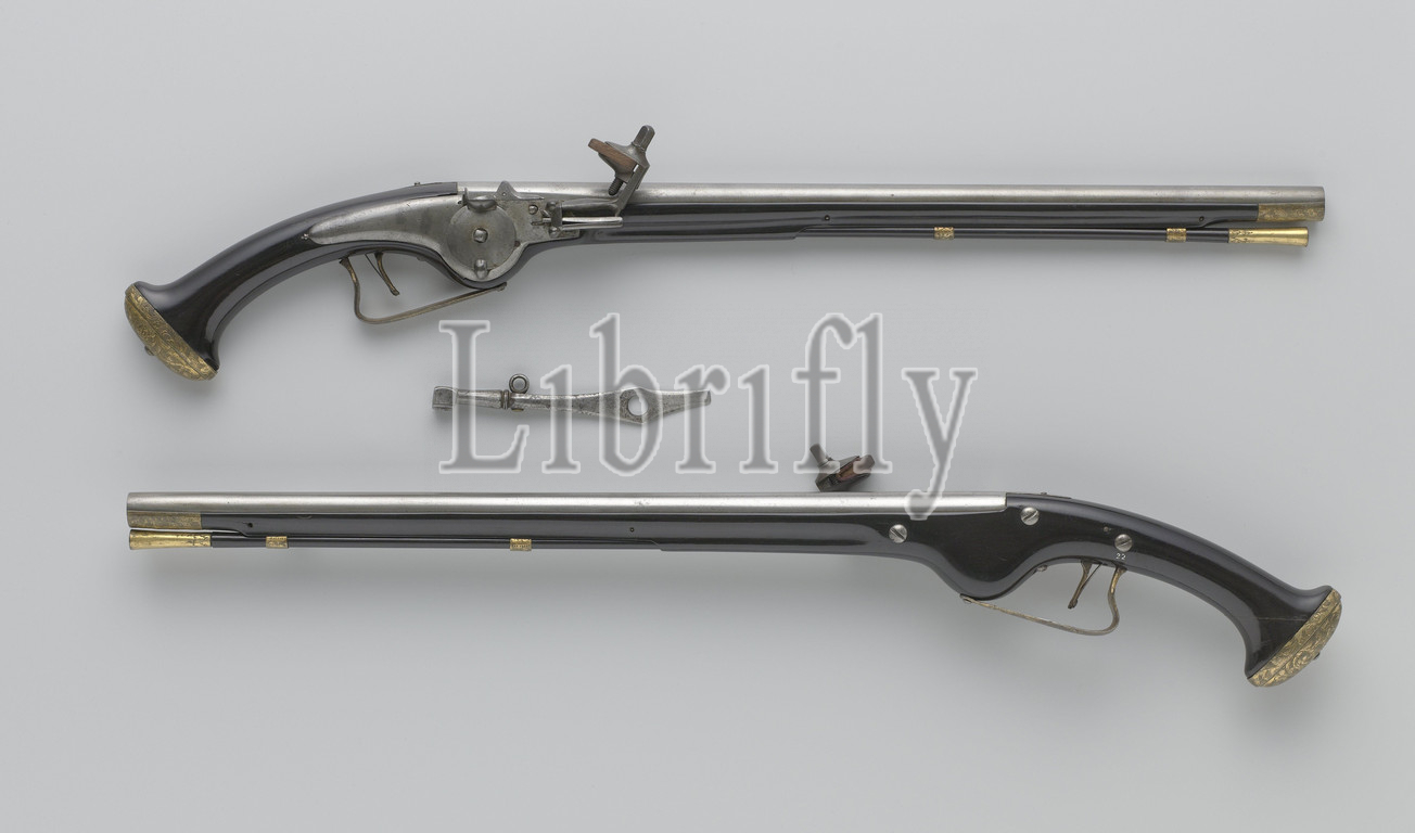 Pair, wheellock pistols, spanner Wheellock pistol, Part, couple, spanner, wheel, lock, provided, hook, bottom, top, round barrel, flat, back, stamped, mark PM, missing, 97-A, ebony flask, grooved front drawer, Apart, gold-plated iron trigger guard, gold-plated copper fittings, engraved, flowers, foliage, consisting, chest, drawers, two loading rod sleeves, butt cap engraved, imprinted, background marked, dots, ebony loading stick, gold-plated brass cap, Peter Meesen, Utrecht, 1655, 1660, ebony, wood, gilding, material, iron, metal, brass, alloy, engraving, l 67 8