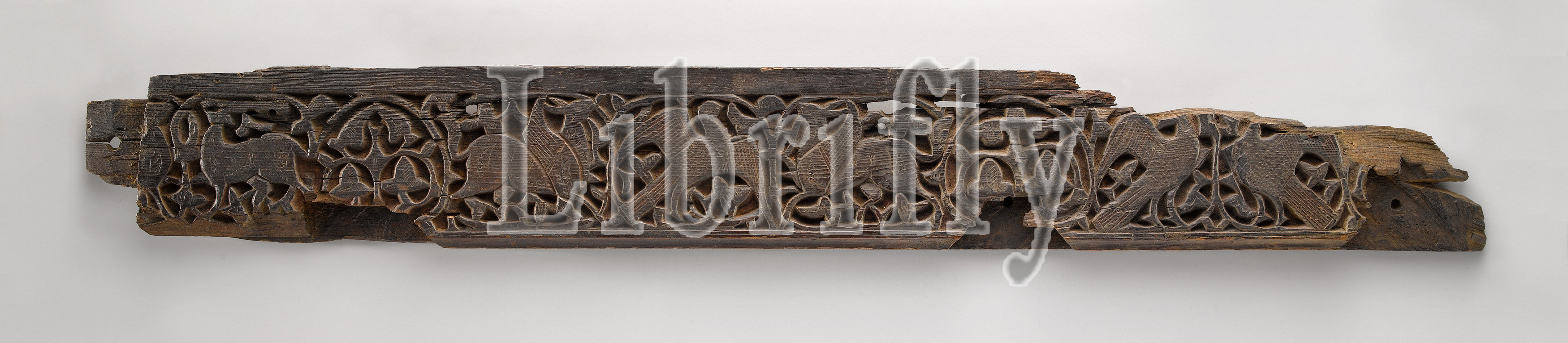Panel with Birds, Griffins, and Animals, 11th–12th century, Attributed to Egypt, Wood; carved, L. 35 1/2 in. (90.1 cm), Wood, Later Fatimid art is characterized by the increased use of relatively naturalistic human and animal motifs. The pattern of antelopes, flying eagles, and griffins on this wooden panel demonstrates that tendency