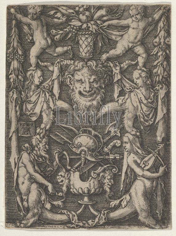 Panel with Grotesque Candelabrum Containing Satyrs, Children and a Trophy, 1550, Engraving, Sheet: 2 11/16 × 1 15/16 in. (6.9 × 5 cm), Heinrich Aldegrever (German, Paderborn ca. 1502–1555/1561 Soest), Ornamental design with a mask at center and a trophy below. Flanking the trophy are two satyrs, the one at right playing an instrument. At the top are two children or putti holding bushels of fruit.