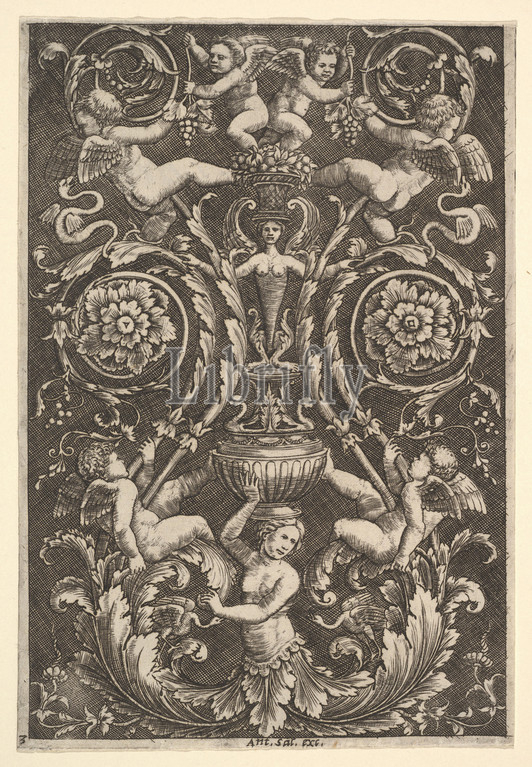panel, ornament, putti, figures, 1530–60, Engraving, sheet, 8 7/16 x 5 11/16, 21.5 14.5 cm, Prints, Master of the Die, Italian, active Rome, ca., After Perino del Vaga, Pietro Buonaccorsi, Florence, 1501–1547, Rome