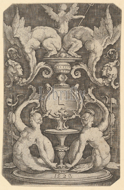 Panel of Ornament with Two Sirens, 1528, Engraving, sheet: 4 5/8 x 3 1/16 in. (11.7 x 7.7 cm), Prints, Lucas van Leyden (Netherlandish, Leiden ca. 1494–1533 Leiden)