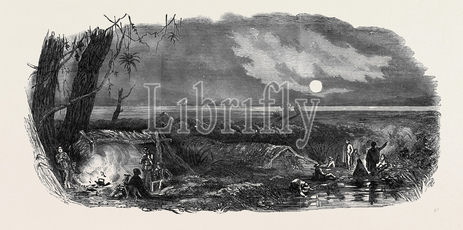parama, new zealand, bivouac, surveyors, 1850 engraving, engraved image, history, illustrative technique, engravement, victorian, arts, culture, retro styled, vintage, retro, arkheia
