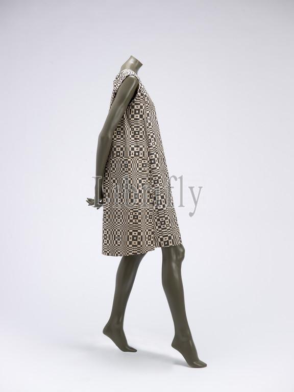 paper dress Paper-Caper Op Art Dress, Scott, Designer, American, 1966, paper, wood pulp, rayon mesh, patented, Dura weave, screen printed, 38-1/2 x 25-1/2, label, Paper-Caper, Textile, Fashion Arts