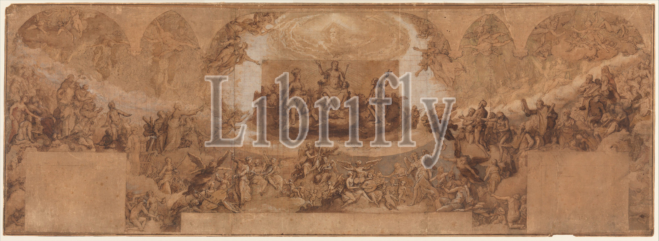 Paradise, 1565–77, Pen and brown ink, brush and brown wash, watercolor, gouache, highlighted with white gouache, left and central sections squared in red chalk, on three sheets of brown paper, joined vertically. A piece of brown paper with figures of Christ, the Virgin, and St. John the Baptist, measuring 14.0 x 24.0 cm., has been affixed at the center of the drawing., 15 7/8 × 44 13/16 in. (40.3 × 113.8 cm), Drawings, Federico Zuccaro (Zuccari) (Italian, Sant'Angelo in Vado 1540/42–1609 Ancona), The present drawing is study for the fresco designed for, but never executed in, the Sala del Maggior Consiglio of the Doges' Palace, Venice. In this representation of Paradise, Christ is seated in judgment at the center and flanked by the Virgin and Saint John the Baptist who intercede for mankind