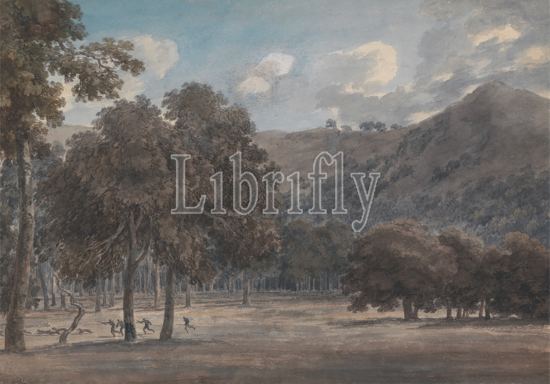 Il Parco degli Astroni, Wooded Crater Bottom, Hunt, Progress, John Robert Cozens, 1752–1797, British, 1783, Watercolor, graphite, medium, slightly textured, cream laid paper, mounted, moderately thick, slightly textured, cream wove paper, Sheet, Mount, clouds, dogs, animals, hunters, landscape, mountains, trees, Italy