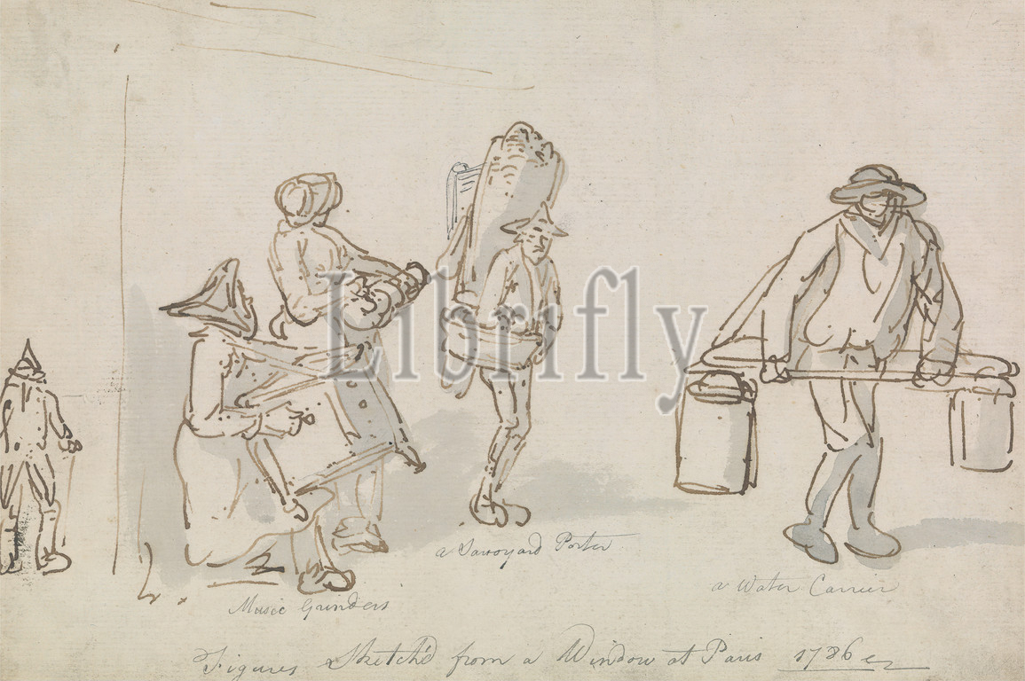 Parisian Street Figures, Thomas Rowlandson, 1756–1827, British, 1786, Gray wash, graphite, pen, brown ink, verso, watercolor, medium, moderately textured, blued white laid paper, Sheet, figures, genre subject, instrument, men, musician, street, Europe, France, Paris
