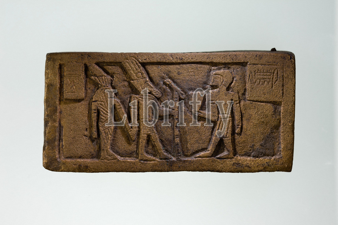 Part of a bronze statue base inscribed in Egyptian and Greek, Late Period, 6th century BC, From Egypt, Copper alloy, Height: 4.5 x W. 9.6 x D. 3 cm (1 3/4 x 3 3/4 x 1 3/16 in.)