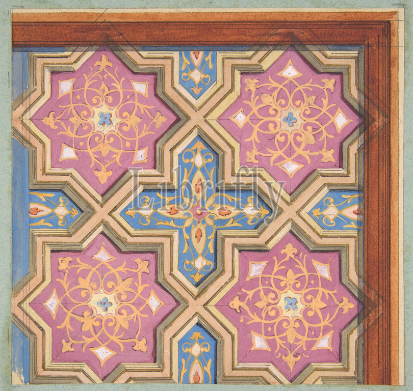 Partial design, decoration, ceiling, 1840–97, graphite, pen, ink, watercolor, gouache, wove paper, inlaid, blue wove, Drawings, Jules-Edmond-Charles Lachaise, French, died, 1897, Eugène-Pierre Gourdet, born Paris, 1820