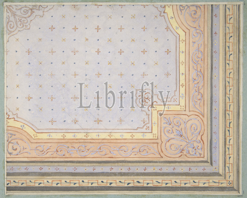 Partial design, painted decoration, ceiling, 1830–97, pen, ink, watercolor, gouache, graphite, wove paper, mounted, blue wove, Overall, 10 7/8 x 8 9/16, 27.6 21.7 cm, Drawings, Jules-Edmond-Charles Lachaise, French, died, 1897, Eugène-Pierre Gourdet, born Paris, 1820