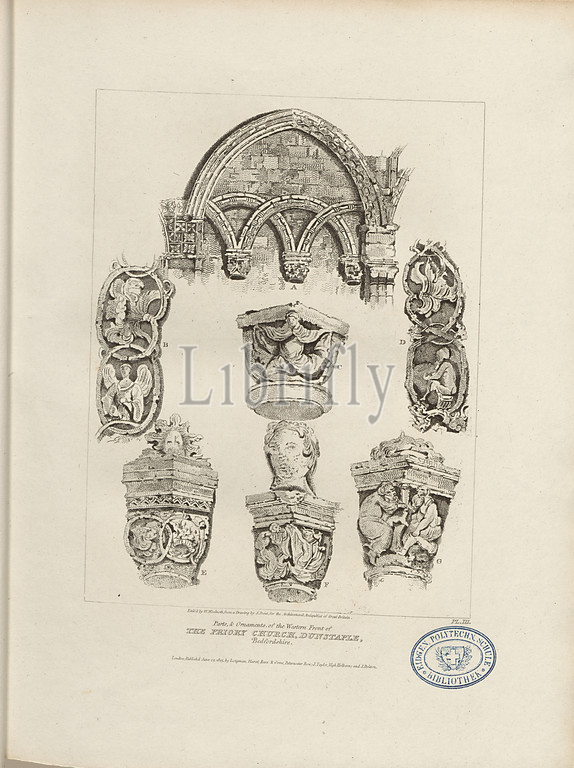 Parts and Ornaments, of the western front of the Priory Church, Dunstable, Details of the facade of the Church of St. Peter the Dustable Priory, signed: Etch'd by W. Woolnoth, from a Drawing by S. Prout, Fig. 8, Pl. III., Prout, S. (Drawing); Woolnoth, W. (Etching), 1805, John Britton: The architectural antiquities of Great Britain: represented and illustrated in a series of views, elevations, plans, sections and details of various ancient English edifices: with historical and descriptive accounts of each. Bd. 1. London: J. Taylor, 1807-1826