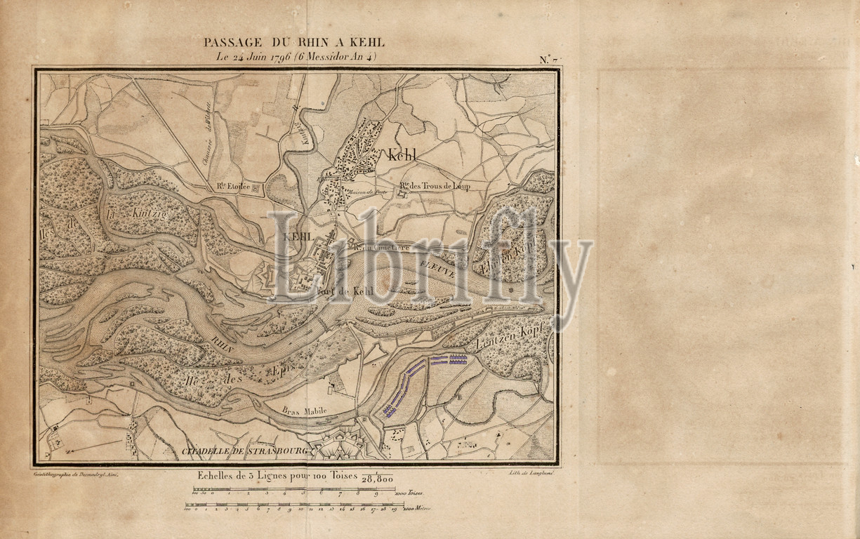 Passage from the Rhine to Kehl, Map Kehl and surroundings Baden-Wurttemberg Germany, N. 7, after p. 32, p. 46, Tome 3, Langlumé (lith.), Maréchal [Laurent de] Gouvion-Saint-Cyr: Mémoires sur les campagnes des armées du Rhin et de Rhin-et-Moselle, de 1792 jusqu'à la paix de Campo-Formio. Tome 3. Paris. Anselin, libraire pour l'art militaire, 1828-1829