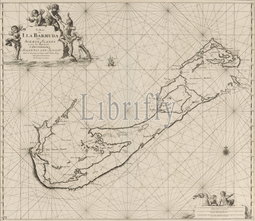 Passport card from Bermuda Passport card from I. La Barmuda other Sommer Ilands in large (title on object), Passport card from Bermuda, with a compass rose, the North is above. Above left the title and address of the publisher, surrounded by young angels and a water-spitting fish. Bottom right two angels on the scale, which is shown in German, Spanish and English or French miles (scale: c. 1: 3 000 000), sailing-ship, sailing-boat, cupids: 'amores' ' amoretti ' ' putti ', monsters of the sea, Jan Luyken, Amsterdam, 1684 - 1799, paper, engraving, h 528 mm × w 603 mm