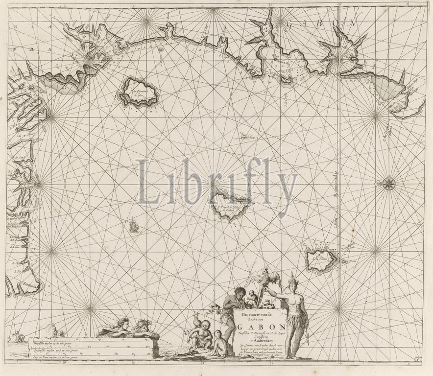 Passport card from the coast of Equatorial Guinea, Gabon and Cameroon Pas caarte van de Bocht van Gabon between C. Formosa and C. de Lopo Gonsalves (title on object), Gabon and Cameroon, with a compass rose, the north is on the left. In the center below the title and address of the publisher, flanked by a man with a feather head and a parrot on his arm, and a man with monkeys and a turtle. Bottom left two sea gods with the scale in German, Spanish and English or French miles (scale: c. 1: 1 100 000), ornamental birds: parrot, African Negro, monkeys, apes, sailing-ship, sailing-boat, tortoises, turtles, Equatorial Guinea, Gabon, Cameroon, Jan Luyken, Amsterdam, 1683 - 1799, paper, engraving, h 508 mm × w 587 mm