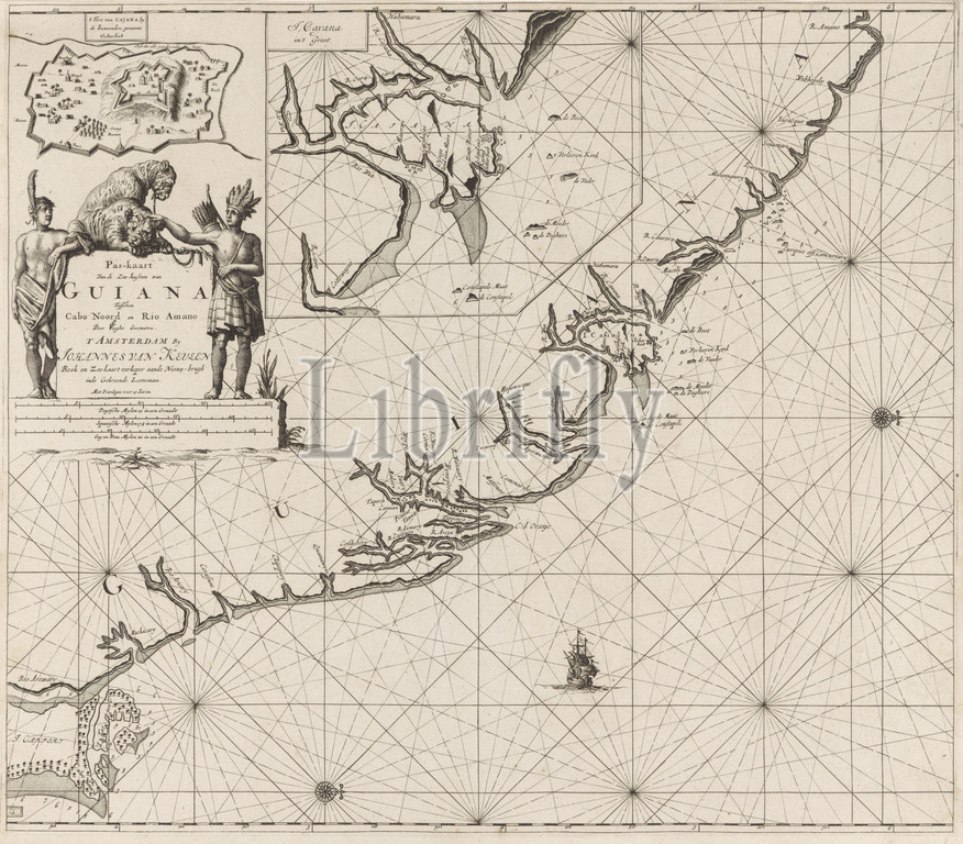 Passport card from the coast of French Guiana Passport card from the sea shores of Guiana between Cabo North and Rio Amano (title on object), Passport card from the coast of French Guiana, with inset maps of the city of Cayenne and the fort of Cayenne and two compass roses, the North on the right. Above left the title, the address of the publisher and the scale in German, Spanish and English or French miles (scale: c. 1: 1 000 000) flanked by two Indians and two tamed panthers, sailing-ship, sailing-boat, beasts or prey, predatory animals: panther, archer's weapons: bow and arrow, French Guiana, Cayenne, Jan Luyken, Amsterdam, 1684 - 1799, paper, engraving, h 517 mm × w 597 mm