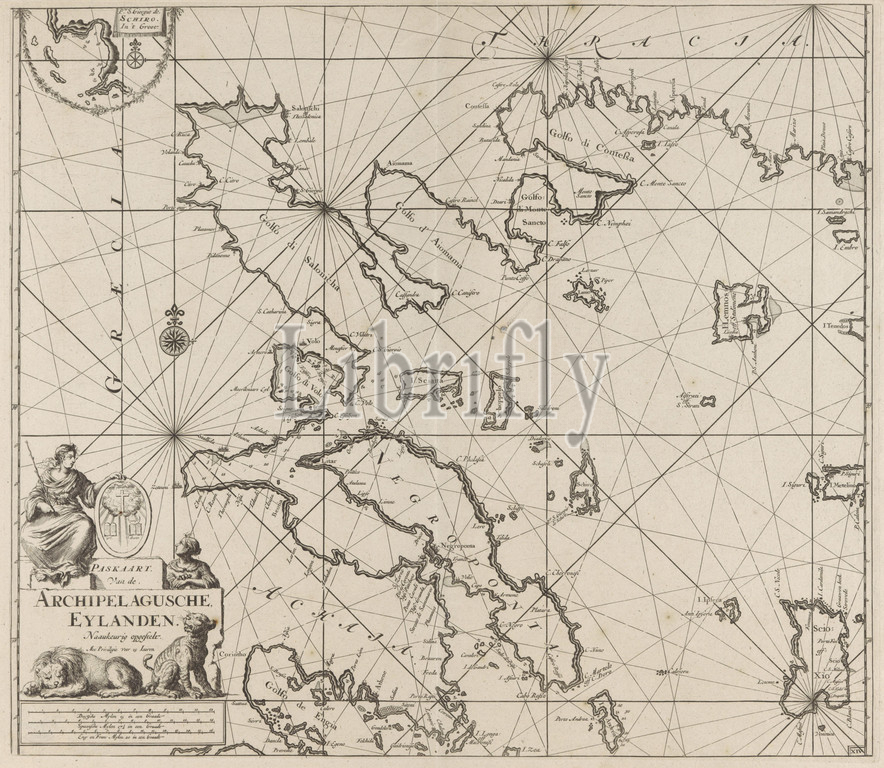 Passport card of the western part of the Aegean Sea with part of the coast of Greece Passport card of the Archipelagus Eylanden (title on object), Passport card of the western part of the Aegean Sea with a part of the coast of Greece, with a stake and two compass roses, the North is above. Bottom left the title and scale, shown in German, Spanish and English or French miles (scale: c. 1: 700 000). With these data a lion pair and a woman with a shield depicting the law, a cross and the Koran, beasts of prey, predatory animals: lion, places and objects of worship, Islam, civil law, cross as symbol of Christ, Aegean Sea, Greece, Jan Luyken, Amsterdam, 1682 - 1803, paper, engraving, h 512 mm × w 588 mm