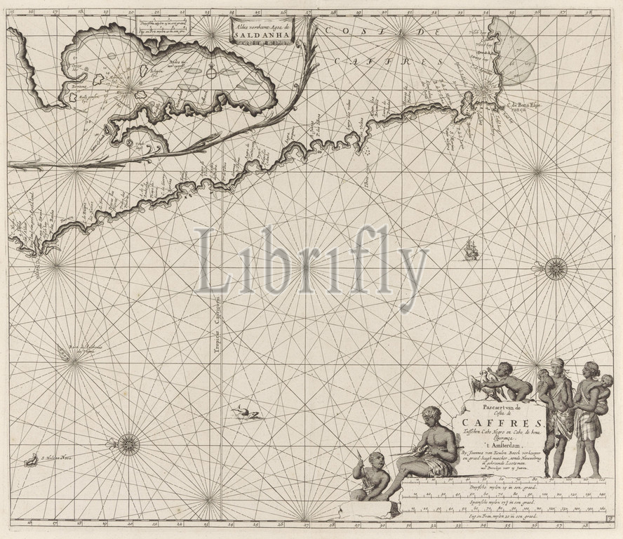 Passport, coast, Namibia, South Africa Pascaert, Costa de Caffres, Cabo Negro, Cabo de bona Esperança, title, object, South Africa, deployment map, Saldanha Bay, two compass roses, North, left, Bottom right, address, publisher, scale, shown, German, Spanish, English, French miles, c, 1, 4 500 000, Dark women, children, African negroes, ornamental birds, parrot, mother, baby, young child, Jan Luyken, Amsterdam, 1683, 1799, paper, engraving