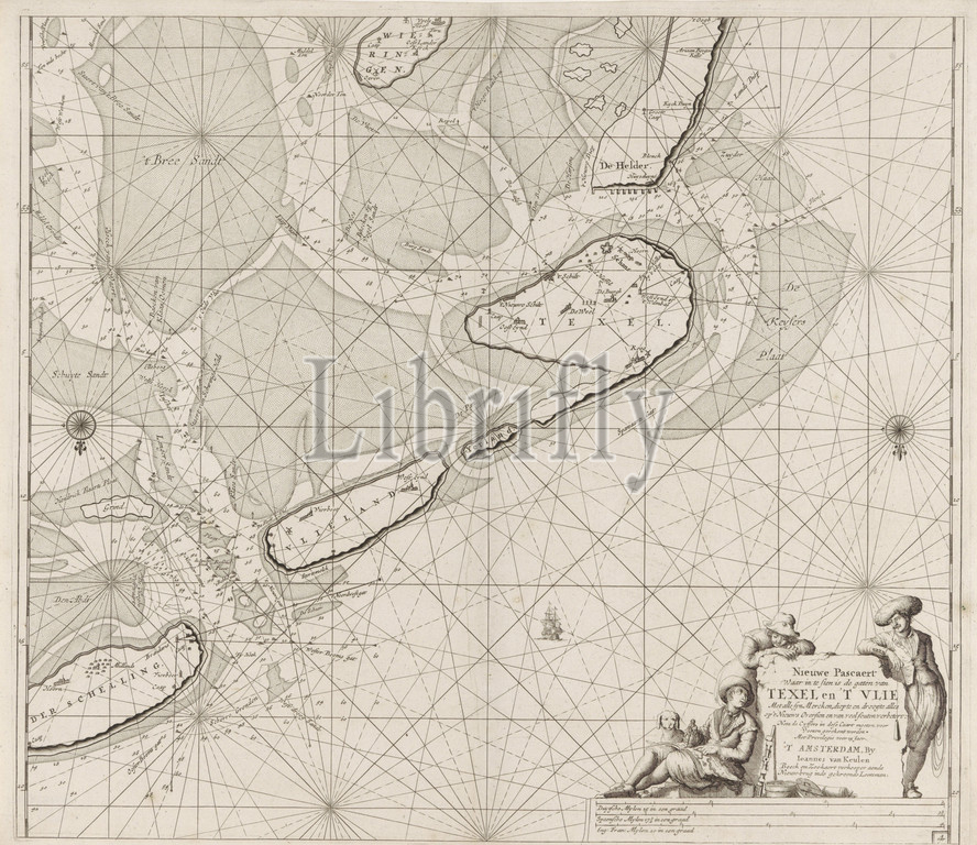 Passport map, Wadden Sea, Den Helder, Terschelling New Pascaert, insert, holes, Texel, 't Vlie, syn Mercken, depth, drought everything, 't Nieuws Oversien, corrected, errors, title, object, Passport, Terschelling, two compass roses, North, Bottom right, cartouche, address, publisher, sailors, instruments, dog, Under, scale, German, Spanish, English, French miles, seaman, maps, atlases, minerals, metals, lead, Vlieland, Wieringen, Jan Luyken, Amsterdam, 1681, 1799, paper, engraving