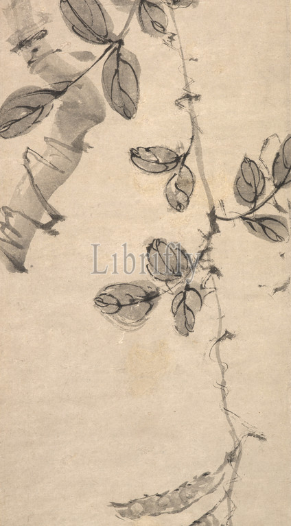 Pea Vine, Autumn Tree, Tang Yin, Chinese, 1470-1524, Ming dynasty, period, Zhengde, 1517, ink, paper, 46-7/16 x 8-1/16, image, 85-1/8 x 14-9/16, installedl, Signed, painted, Xuepu's grass hut, Wuqu Seal, Tang Bohu Seal, Meng mo ting, Inscribed, lamplight, illuminating, my, bed, frame, overwhelms, evening rain., rustic man's fence, autumn gusts blow, Asian Art