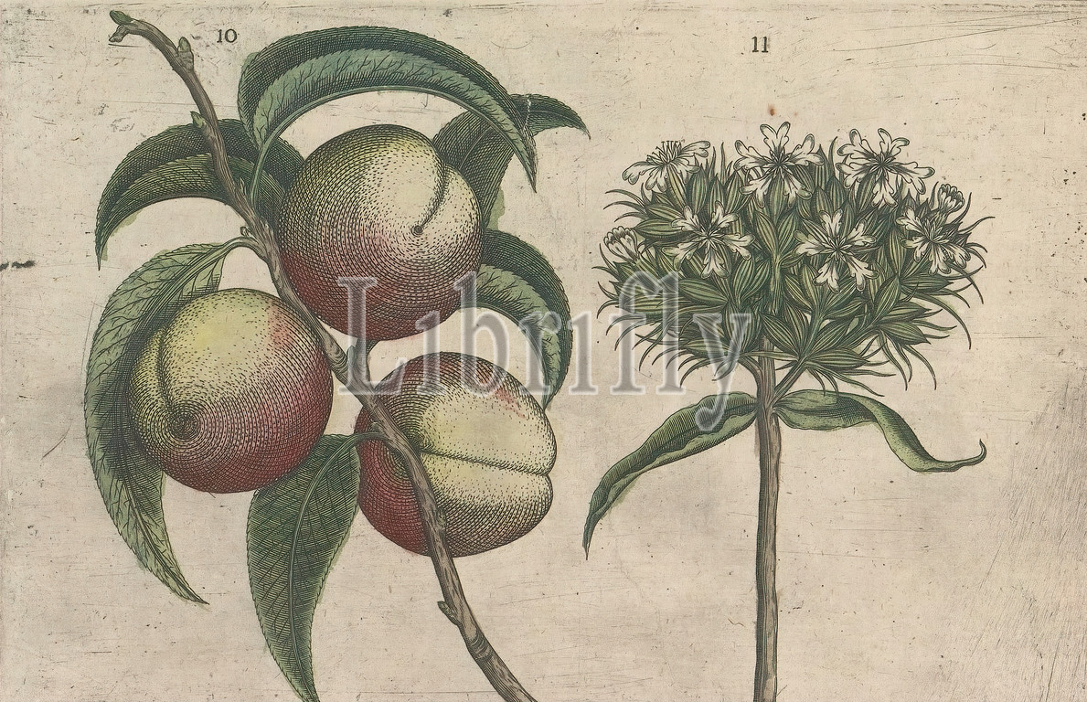 Peach, Prunus persica, burning love, Silene chalcedonica, FIGs, 10, 11, sheet hand numbered 6, Anselmi Boetii de Boot I.C, Brugensis & Rodolphi II, Imp, Novel, medici, cubiculis Florum, Herbarum, ac fructuum selectiorum icones, & vires pleraeque hactenus ignotæ, Part, album, sheets, plates, De Boodts herbarium, 1640, twelfth, twelve albums, watercolors, animals, birds, plants, 1600, commissioned, Emperor Rudolf II, fruits, peach, 1604, 1632, paper, ink, watercolor, paint, engraving