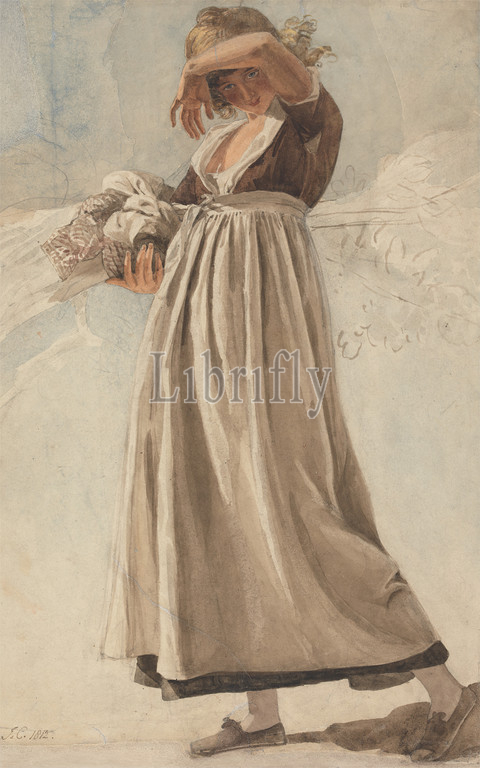 Peasant Girl Shading, Eyes, Joshua Cristall, 1768–1847, British, 1812, Watercolor, graphite, moderately thick, slightly textured, cream wove paper, laid, thick, rough, beige wove paper, Sheet, apron, dress, fabric, gaze, genre subject, gesturing, girl, kerchief, peasant, shoes, sunlight, walking