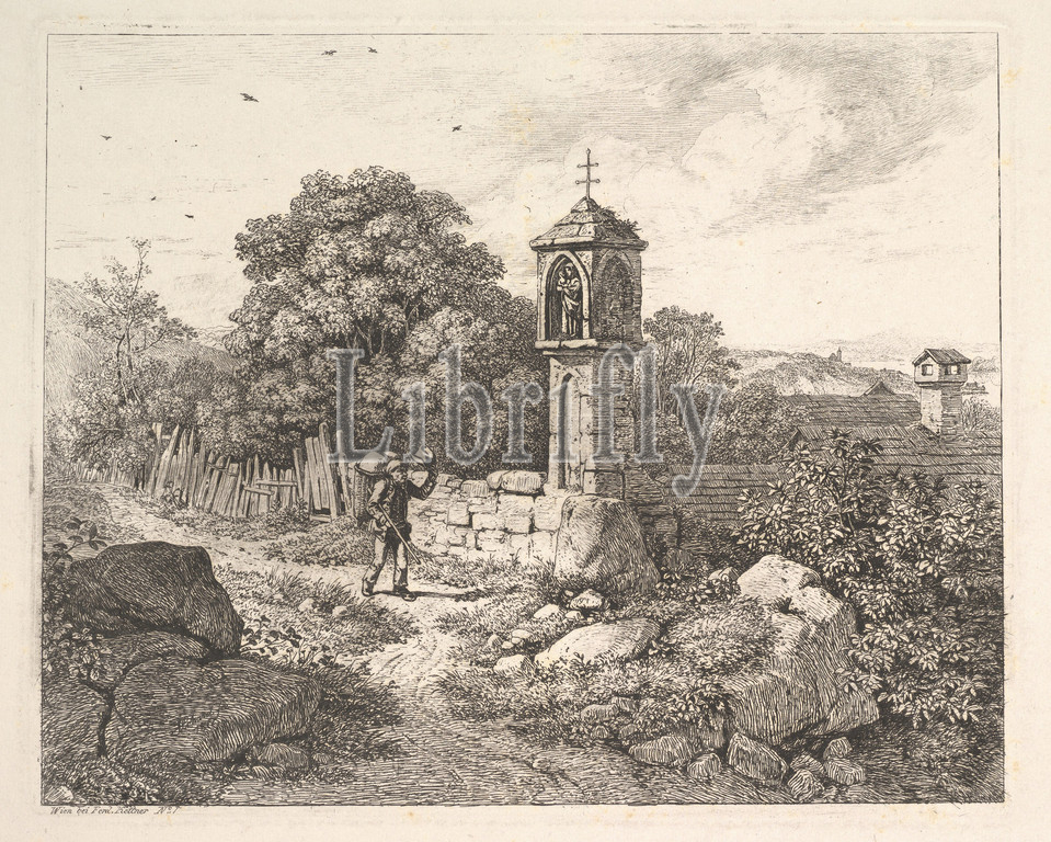 A Peasant Greeting the Statue of Mary, 1817, Etching; fourth state, plate: 6 5/8 x 8 in. , Prints, Johann Christoph Erhard (German, Nuremberg 1795–1822 Rome), After Ferdinand Kettner