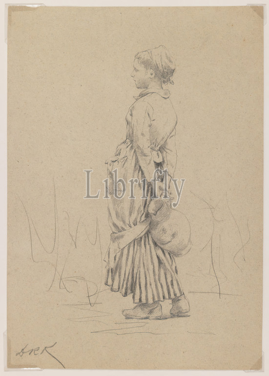 Peasant, Water Jug, Study, Well', Daniel Ridgway Knight, American, 1839-1924, Graphite, brown colored, medium weight, slightly textured wove paper, ca. 1880, Sheet, 10 1/8 x 7 1/8, 25.7 x 18.1 cm, 1880, American, American art, clogs, coquette, Daniel Ridgway Knight, drawing, fine lines, girl, graphite, IMLS, jug, pocket, sketch, striped, study, waiting, water, well, woman, work