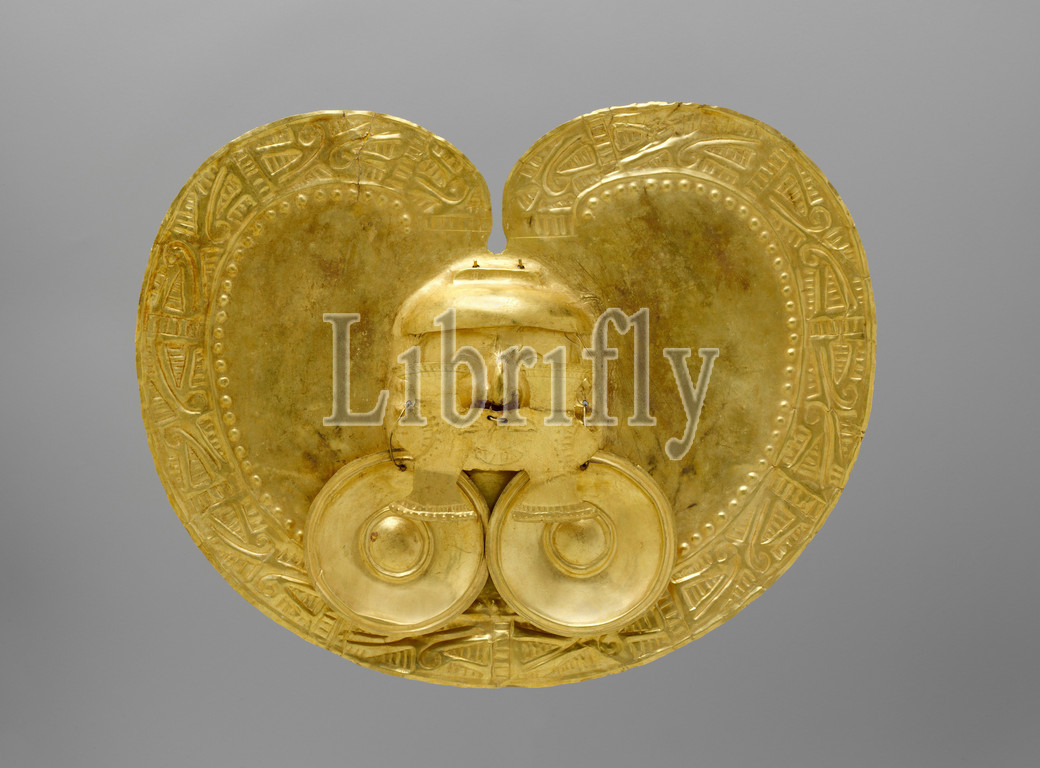 Pectoral, Face, 1st–7th century, Colombia, Calima, Yotoco, Gold, hammered, H, 8 3/4 x W, 11 D, 1 3/8, 22.2 27.9 3.5 cm, Metal-Ornaments, large, H-shaped, nose, pendant, almost, entirely, obscures, face, center, gold, kidney-shaped pectoral, shape, pectoral, form, nose pendant, hallmarks, Yotoco-period Calima, art