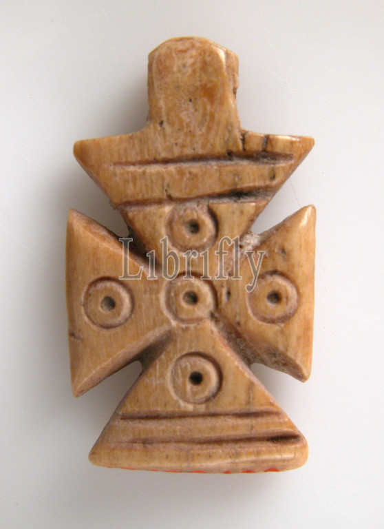 Pendant Cross, 5th–8th century, Egypt, Maghagha, Bone, H, 1 1/8, 2.9 cm, Ivories, small, cross, haven, strung, necklace, string, worn, neck, decorated, pattern, incised circles, Similar patterns, concentric, early Byzantine, art