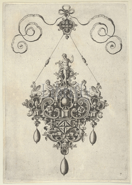 Pendant Design with Apollo Standing on an Arch Flanked by Female Figures Holding Fruit, after 1581, Engraving; second state of two (New Hollstein), Sheet: 7 × 4 13/16 in. (17.8 × 12.2 cm), Jan Collaert I (Netherlandish, Antwerp ca. 1530–1581 Antwerp), Vertical panel with a pendant design at center, with Apollo standing on an arch at top. The figure holds a lyre in his right hand and gestures upwards with his left. At the left and right side of the ornament, nude female figures recline against elements of the strapwork background and hold fruit