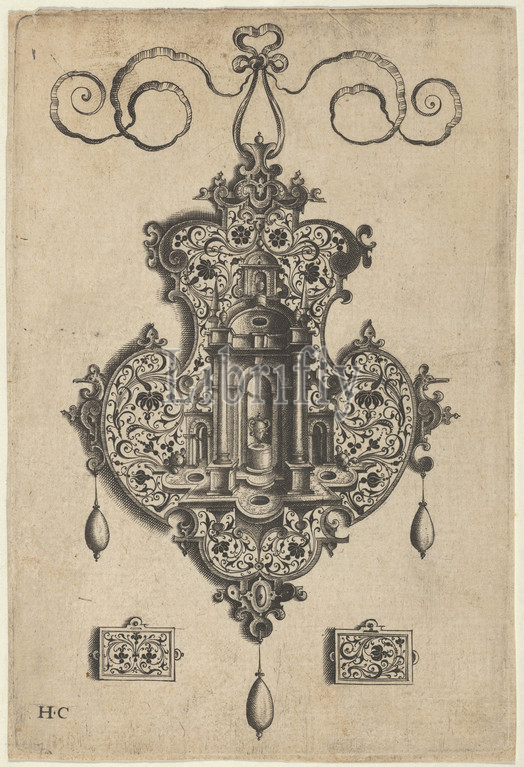Pendant Design with Niche and a Vase with Two Handles Above Rectangular Ornaments, before 1573, Engraving and blackwork; first state of two (New Hollstein), Sheet: 5 13/16 × 3 15/16 in. (14.8 × 10 cm), Jan Collaert I (Netherlandish, Antwerp ca. 1530–1581 Antwerp), Vertical panel with a design for a pendant at center with a niche and a two-handled vase on a pedastal, on an arabesque pattern. At bottom, two horizontal ornaments, possibly designs for earrings or buttons