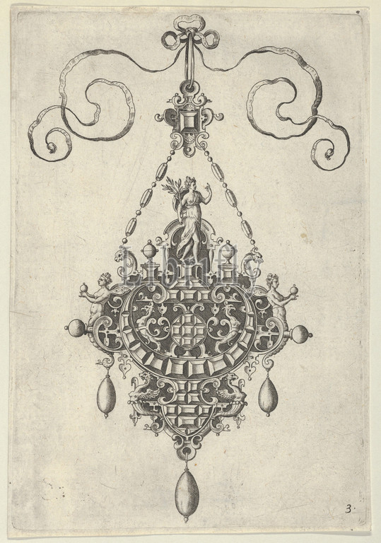 Pendant Design with Pax Standing Before an Arch, after 1581, Engraving; second state of two (New Hollstein), Sheet: 6 7/8 × 4 13/16 in. (17.5 × 12.2 cm), Jan Collaert I (Netherlandish, Antwerp ca. 1530–1581 Antwerp), Vertical panel with a pendant design at center, with Pax standing on strapwork at top and holding a branch at her right side between chains that suspends the ornament from a ribbon at top. At left and right side of the ornament, female figures with insect wings hold out orbs