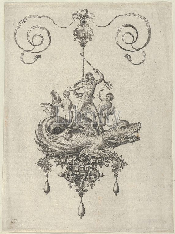Pendant Design with a Sea Monster Carrying Neptune Flanked by Two Figures with Horns, 1582, Engraving; second state of two (New Hollstein), Sheet: 7 1/16 × 5 3/16 in. (17.9 × 13.1 cm), Adriaen Collaert (Netherlandish, Antwerp ca. 1560–1618 Antwerp), after a design by Jan Collaert I (Netherlandish, Antwerp ca. 1530–1581 Antwerp), Vertical panel with a pendant in the shape of a sea monster carrying Neptune, who stands on the monster's back and is flanked by two nude figures who carry horn-shaped vessels. The ornament is suspended from a small jewelled motif tied with a ribbon at top