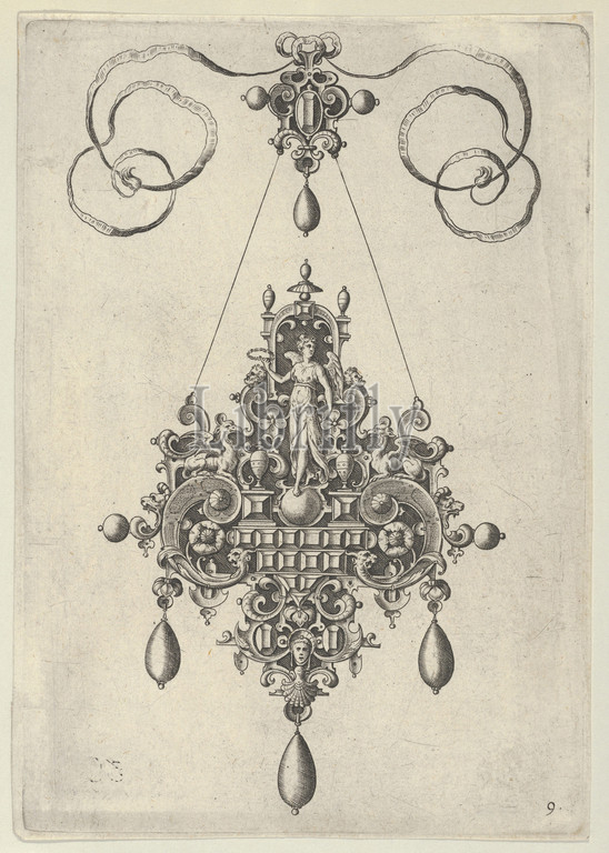 Pendant Design with Winged Victory Holding a Laurel Wreath, after 1581, Engraving; second state of two (New Hollstein), Sheet: 6 7/8 × 4 13/16 in. (17.5 × 12.2 cm), Jan Collaert I (Netherlandish, Antwerp ca. 1530–1581 Antwerp), Vertical panel with a pendant design at center, with a winged female figure standing on an orb and holding up a laurel wreath in her right hand. The figure is set in a strapwork background and is flanked by inward-facing griffins